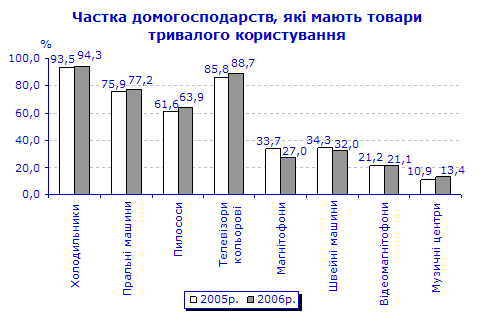 Підсумки опитування, розповсюджені на всі домогосподарства України, свідчать, що у порівнянні з результатами аналогічного опитування, проведеного у жовтні 2005р., покращилася забезпеченість домогосподарств окремими товарами тривалого користування, зокрема, холодильниками, пральними машинами, пилососами, кольоровими телевізорами та музичними центрами (додаток 1). Кольорові телевізори та холодильники мали відповідно дев’ять з десяти домогосподарств, пральні машини – майже чотири з п’яти, пилососи – три з п’яти, мобільні телефони – майже половина, швейні машини та фотоапарати – відповідно кожне третє домогосподарство, відеомагнітофони – кожне п’яте та мікрохвильові печі – кожне сьоме домогосподарство (додаток 2).