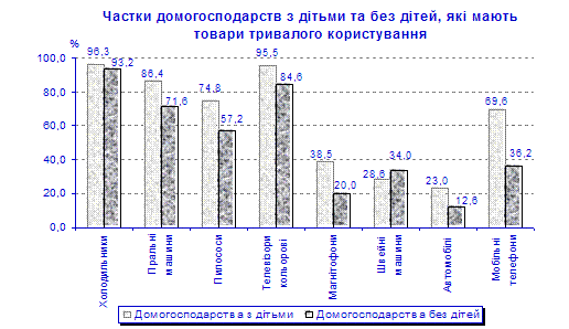 Зокрема, серед 100 домогосподарств з однією або двома дітьми холодильники мали 97 домогосподарств (серед багатодітних – 89), пральні машини – відповідно 87 (80), пилососи – 76 (52), кольорові телевізори – 96 (89), фотоапарати – 55 (44), відеомагнітофони – 33 (26), комп’ютери – 18 (11).