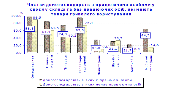 Наявність працюючих осіб у складі домогосподарств сприяла більш високому рівню їх забезпеченості сучасними товарами культурно-побутового призначення порівняно з домогосподарствами, у складі яких працюючих осіб немає. Найбільші розбіжності були відмічені щодо наявності відеокамер, комп’ютерів, музичних центрів, програвачів CD-дисків, відеомагнітофонів, мікрохвильових печей, фотоапаратів, кухонних комбайнів, мобільних телефонів, автомобілів та магнітофонів. Частки домогосподарств, які мали ці товари, серед домогосподарств, у складі яких є працюючі особи, були в 19–4 рази вище, ніж серед домогосподарств, в яких ніхто не працював.