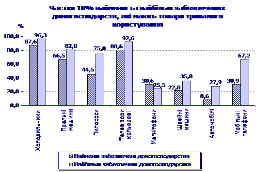 Частки домогосподарств найменш забезпеченої децильної групи та групи з середньодушовими сукупними витратами нижче прожиткового мінімуму, які мали пилососи, швейні машини, пральні машини та кольорові телевізори, були відповідно в 1,7–1,1 раза та в 1,3–1,1 раза менше, ніж серед найбільш заможних домогосподарств, які складають десятий дециль (у 2005р. – в 1,8–1,2 раза та в 1,3–1,1 раза) (додаток 4). Слід відмітити, що серед найменш забезпечених домогосподарств частки пилососів, автомобілів, пральних машин, холодильників та кольорових телевізорів, куплених більше 10 років тому, були в 1,4–1,6 раза вищими порівняно з відповідними показниками серед 10% найбільш заможних домогосподарств.