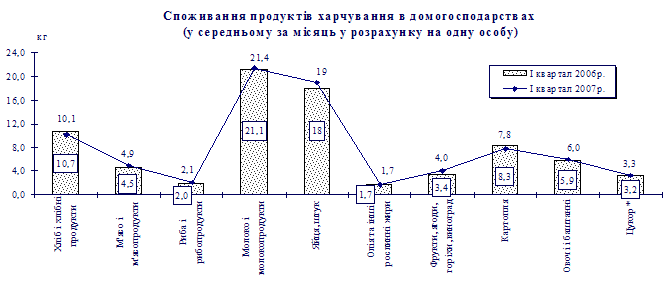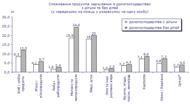 У домогосподарствах з дітьми однією особою було спожито на 8–3% більше, ніж у січні–березні 2006р., м’яса та м’ясопродуктів, риби та рибопродуктів, яєць, цукру, молока та молочних продуктів, у 1,2 раза – фруктів, ягід, горіхів та винограду. Одночасно у цій групі домогосподарств зменшилося на 7% споживання картоплі та на 6% – хліба і хлібних продуктів. Залишилося на рівні І кварталу минулого року споживання олії та інших рослинних жирів, а також овочів і баштанних. Кількість основних продуктів харчування, спожитих однією особою в домогосподарствах з дітьми, була в 1,6–1,1 раза меншою, ніж у домогосподарствах без дітей.