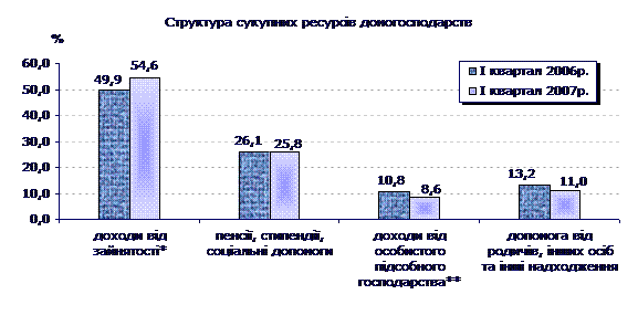 Продовжувалися позитивні зміни у структурі формування ресурсів домогосподарств. Збільшилася частка грошових доходів у структурі сукупних ресурсів домогосподарств з 84% у січні–березні 2006р. до 87% у І кварталі 2007р.