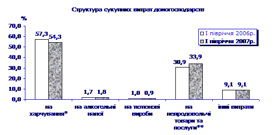 Найбільш вагомою статтею (54%) сукупних витрат домогосподарств продовжували залишатися витрати на харчування (включаючи харчування поза домом). У порівнянні з І півріччям 2006р. частка цих витрат зменшилася на 3 в.п.