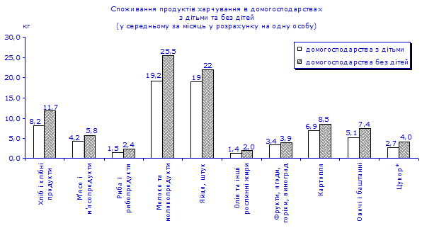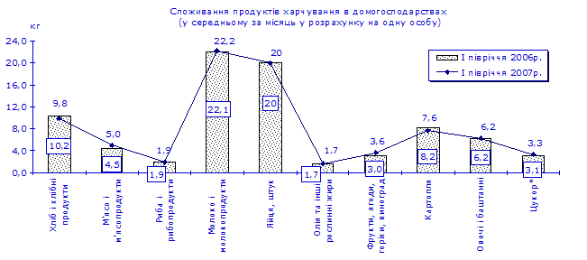 У домогосподарствах з дітьми однією особою було спожито більше, ніж у січні–червні 2006р., фруктів, ягід, горіхів та винограду – на 21%, м’яса та м’ясопродуктів – на 11%, яєць, цукру, молока та молочних продуктів – на 6–2%. Одночасно у цій групі домогосподарств зменшилося на 7% споживання картоплі та на 4% – хліба і хлібних продуктів. Залишилося на рівні І півріччя минулого року споживання овочів і баштанних, риби та рибних продуктів, а також олії та інших рослинних жирів. Кількість основних продуктів харчування, спожитих однією особою в домогосподарствах з дітьми, була в 1,6–1,1 раза меншою, ніж у домогосподарствах без дітей.