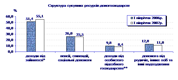 Більше трьох п’ятих сукупних ресурсів міських домогосподарств становили доходи від зайнятості (їх частка порівняно з I півріччям минулого року збільшилася на 4 в.п.), 23% – пенсії, стипендії та соціальні допомоги, надані готівкою, 2% – доходи від особистого підсобного господарства (їх частки зменшилися на 0,7 в.п. кожна).