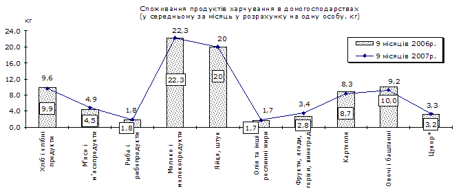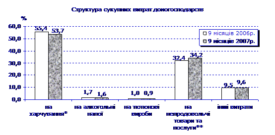 Найбільш вагомою статтею сукупних витрат домогосподарств продовжували залишатися витрати на харчування (включаючи харчування поза домом). Порівняно з січнем–вереснем 2006р. частка цих витрат зменшилася на 1,7 в.п. і становила 54%.