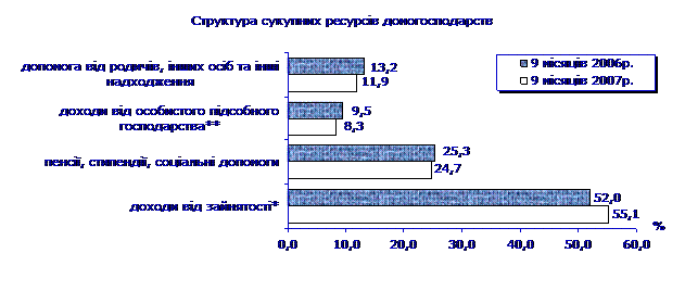 Середньомісячні загальні доходи одного домогосподарства за 9 місяців 2007р. склали 1860 грн. Міське домогосподарство отримувало в середньому за місяць 1941 грн., сільське – 1681 грн. У середньому на одного члена домогосподарства загальні доходи становили 715 грн. на місяць, у міських домогосподарствах – 764 грн., у сільських – 613 грн. Рівень середньомісячних загальних доходів однієї особи перевищив рівень встановленого у ІІІ кварталі 2007р. прожиткового мінімуму (525 грн.) на 36%. Слід зазначити, що темп росту середньодушових загальних доходів у січні–вересні 2007р. порівняно з аналогічним періодом 2006р. перевищив індекс споживчих цін за цей період: відповідно 124,1% проти 111,9%.