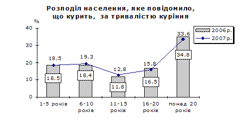 Порівняно з 2006р. зменшилася частка осіб, які курять 16 і більше років, та зросла частка осіб з менш тривалим стажем куріння.
