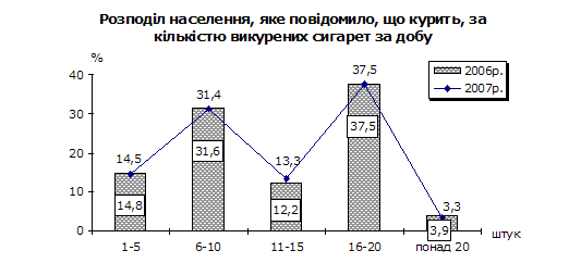 Серед дорослих чоловіків курять, як і у 2006р., майже кожні три з п’яти осіб у віці 18–59 років, кожна третя особа непрацездатного віку. Слід відмітити, що порівняно з 2006р. серед дорослих чоловіків в усіх статево-вікових групах частка таких, які курять, зменшилася на 0,3–2,8 в.п. Серед жінок тютюнокуріння найбільш поширене в активному дітородному віці: як і в 2006р., повідомила, що курить, кожна дев’ята жінка у віці 18–29 років. Викликає також занепокоєння куріння дітей та підлітків: за даними опитування курять 0,8% дітей 12–13 років, 1% хлопців та 0,4% дівчат у віці 14–15 років. Як і в попередньому році, серед підлітків у віці 16–17 років курять 16% хлопців та 3% дівчат.