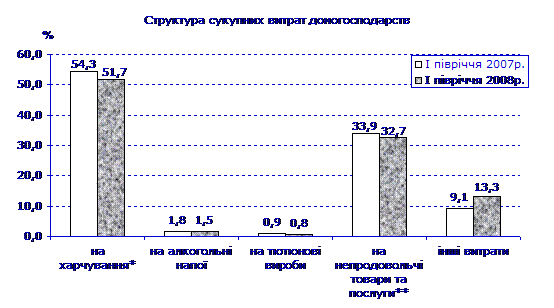 Найбільш вагомою статтею (52%) сукупних витрат домогосподарств продовжували залишатися витрати на харчування (включаючи харчування поза домом). Порівняно з І півріччям 2007р. частка цих витрат зменшилася на 3 в.п.