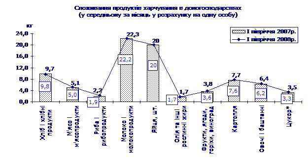 Зростання у січні–червні 2008р. порівняно з аналогічним періодом 2007р. реальних наявних доходів населення сприяло підвищенню споживчих можливостей населення у забезпеченні належного рівня харчування. Відбулося деяке покращання структури харчування: збільшилося споживання в домогосподарствах риби та рибопродуктів – на 16%, фруктів, ягід, горіхів та винограду, а також цукру – відповідно на 6%, овочів і баштанних – на 3%, м’яса та м’ясопродуктів – на 2%, картоплі – на 1% та молока і молочних продуктів – на 0,5% (додаток 4). Залишилося на рівні I півріччя 2007р. споживання яєць, олії та інших рослинних жирів. Скоротилося споживання (на 1%) хліба і хлібних продуктів.