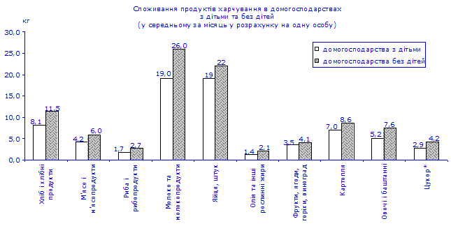 У домогосподарствах з дітьми однією особою було спожито більше, ніж у січні–червні 2007р., риби та рибопродуктів – на 13%, цукру, фруктів, ягід, горіхів та винограду, овочів і баштанних, картоплі – на 7–1%. Одночасно у цій групі домогосподарств зменшилося на 1% споживання молока та молокопродуктів, хліба і хлібопродуктів. Залишилося на рівні І півріччя минулого року споживання м’яса та м’ясопродуктів, яєць, а також олії та інших рослинних жирів. Кількість основних продуктів харчування, спожитих однією особою в домогосподарствах з дітьми, була в 1,6–1,2 раза меншою, ніж у домогосподарствах без дітей.