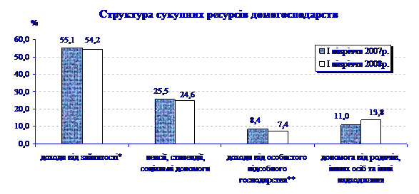 Більше половини сукупних ресурсів домогосподарств складали доходи від зайнятості, частка яких порівняно з І півріччям 2007р. зменшилася на 0,9 в.п. При цьому частка оплати праці зменшилася на 1,6 в.п. (до 49%), а доходів від підприємницької діяльності та самозайнятості – зросла на 0,7 в.п. (до 5%).