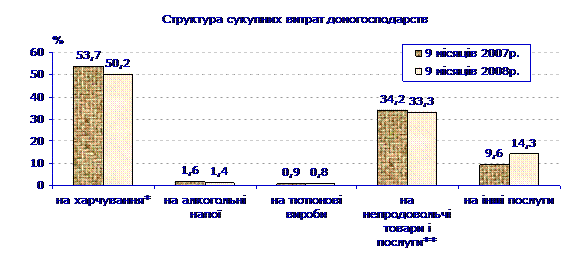 Найбільш вагомою статтею (50%) сукупних витрат домогосподарств продовжували залишатися витрати на харчування (включаючи харчування поза домом). Порівняно з січнем–вереснем 2007р. частка цих витрат зменшилася на 3,5 в.п.