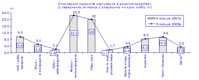 Зростання у січні–вересні 2008р. порівняно з січнем–вереснем 2007р. реальних наявних доходів населення сприяло підвищенню споживчих можливостей населення у забезпеченні належного рівня харчування. Відбулося деяке покращання структури харчування: збільшилося споживання в домогосподарствах риби та рибопродуктів – на 17%, фруктів, ягід, горіхів та винограду, а також цукру – відповідно на 6%, овочів та баштанних – на 4%, м’яса та м’ясопродуктів – на 2% та молока і молочних продуктів – на 1%. Залишилося на рівні січня–вересня 2007р. споживання яєць, олії та інших рослинних жирів, картоплі. Скоротилося споживання хліба і хлібних продуктів (на 1%) (додаток 4).