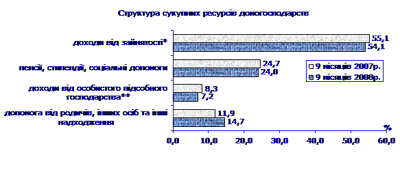 Більше трьох п’ятих сукупних ресурсів міських домогосподарств становили доходи від зайнятості (їх частка порівняно з січнем–вереснем 2007р. зменшилася на 2 в.п.), 22% – пенсії, стипендії та соціальні допомоги, надані готівкою, 2% – доходи від особистого підсобного господарства (їх частки зменшилися на 0,4 в.п. та 0,2 в.п. відповідно).