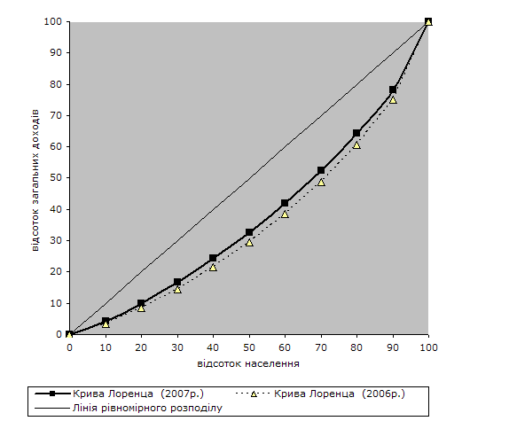 Крива Лоренца відображає співвідношення відсотків усіх загальних доходів та відповідних відсотків населення, які їх отримали. Якби загальні доходи розподілялися рівномірно, то 10% населення отримували б десяту частину загальних доходів, 20% – п’яту частину загальних доходів, 50% – половину і т.д., і розподіл мав би вигляд лінії рівномірного розподілу (по діагоналі квадрату зі сторонами від 0 до 100%). Нерівномірний розподіл характеризується кривою Лоренца (лінією фактичного розподілу). Чим далі від прямої ця лінія, тим більше диференціація населення за рівнем добробуту.