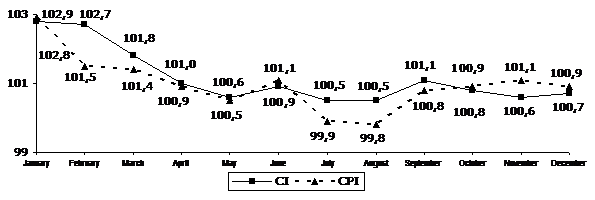 Core inflation (CI) in December 2009 was 100,7%, from the beginning of the year it was 114,9% (in December 2008 – 102,0%, from the beginning of the year – 121,3%).