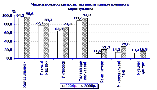 Держкомстатом України у жовтні 2008р. проведене опитування 10,6 тис. домогосподарств, що брали участь у вибірковому обстеженні умов їх життя, стосовно наявності товарів тривалого користування.
