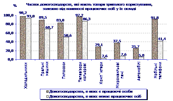 Наявність працюючих осіб у складі домогосподарств сприяла більш високому рівню їх забезпеченості сучасними товарами культурно-побутового призначення порівняно з домогосподарствами, у складі яких працюючих осіб немає. Найбільші розбіжності були відмічені щодо наявності відеокамер, комп’ютерів, музичних центрів, програвачів CD-дисків, відеомагнітофонів, кухонних комбайнів, фотоапаратів, кондиціонерів, посудомийних машин та мікрохвильових печей. Частки домогосподарств, які мали ці товари, серед домогосподарств, у складі яких є працюючі особи, були в 14–5 разів вище, ніж серед домогосподарств, в яких ніхто не працював.