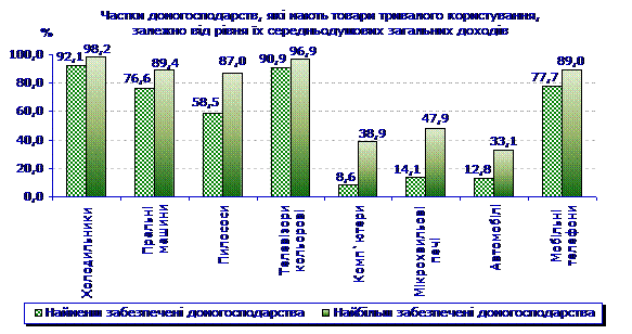 Частки домогосподарств найменш забезпеченої децильної групи та групи з середньодушовими загальними доходами нижче прожиткового мінімуму, які мали комп’ютери, мікрохвильові печі, автомобілі, швейні машини та пилососи, були відповідно в 4,5–1,5 раза та в 3,6–1,4 раза менше, ніж серед найбільш заможних домогосподарств, які складають десятий дециль (додаток 4). Слід відмітити, що серед найменш забезпечених домогосподарств частки наявних пральних машин, автомобілів, холодильників, кольорових телевізорів, пилососів та швейних машин, куплених більше 10 років тому, були в 1,9–1,1 раза вищими порівняно з відповідними показниками забезпеченості товарами тривалого користування серед 10% найбільш заможних домогосподарств.