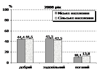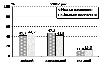 Порівняння самооцінки здоров’я серед міського та сільського населення свідчить, що серед останніх майже в усіх статево-вікових групах частка осіб, які почували себе добре, вища. Це пов’язано зі значно меншим негативним впливом несприятливих екологічних, техногенних факторів та психоемоційних перевантажень, притаманних способу життя мешканців сучасних міст, особливо мегаполісів. Найбільша частка населення, яке оцінило стан свого здоров’я як “добрий”, відмічена у Львівській, Волинській, Тернопільській, Івано-Франківській, Чернівецькій, Закарпатській, Одеській, Миколаївській областях, у м.Севастополі та в Автономній Республіці Крим (63–48%), а найнижча – у Кіровоградській, Херсонській, Сумській, Харківській, Чернігівській, Житомирській та Донецькій областях (38–31%). При цьому для Донецької та Харківської областей характерні високий рівень урбанізації та розвитку промисловості. Для інших регіонів з низькою оцінкою стану здоров’я населенням (крім Херсонської області) характерна вища, порівняно з середньою по країні, частка осіб похилого віку у структурі населення. Також для них характерний вищий за середній по країні рівень бідності.