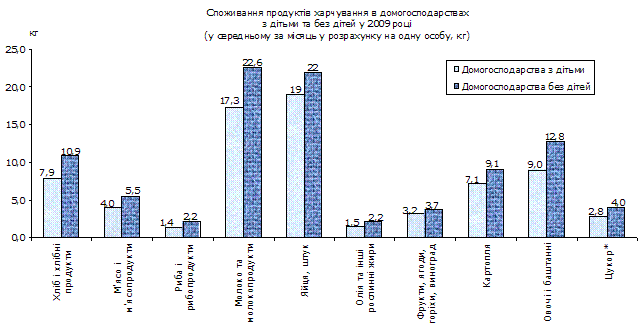 У домогосподарствах з дітьми однією особою було спожито більше, ніж у січні–вересні 2008р., овочів та баштанних – на 13%, олії та інших рослинних жирів – на 7%. Одночасно у цій групі домогосподарств зменшилося споживання риби та рибних продуктів – на 13%, молока та молочних продуктів – на 10%, м’яса та м’ясопродуктів – на 5%, картоплі – на 4%, фруктів, ягід, горіхів та винограду – на 3%. Залишилося на рівні 9 місяців 2008р. споживання хліба і хлібних продуктів, яєць та цукру. Кількість основних продуктів харчування, спожитих однією особою в домогосподарствах з дітьми, була в 1,6–1,2 раза меншою, ніж у домогосподарствах без дітей.