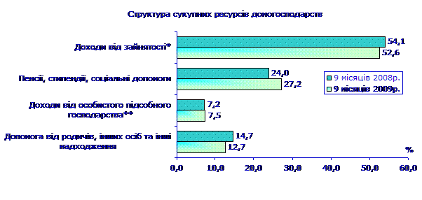 січні–вересні 2008р., 63% ресурсів формували доходи від зайнятості, шосту