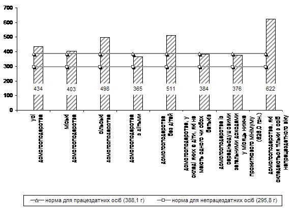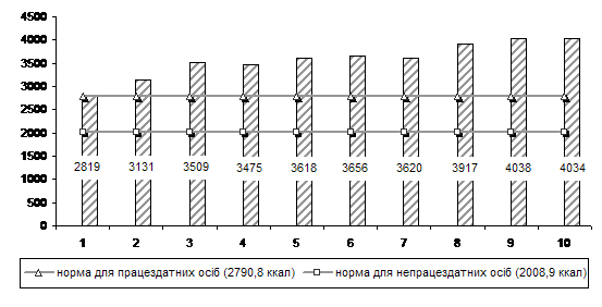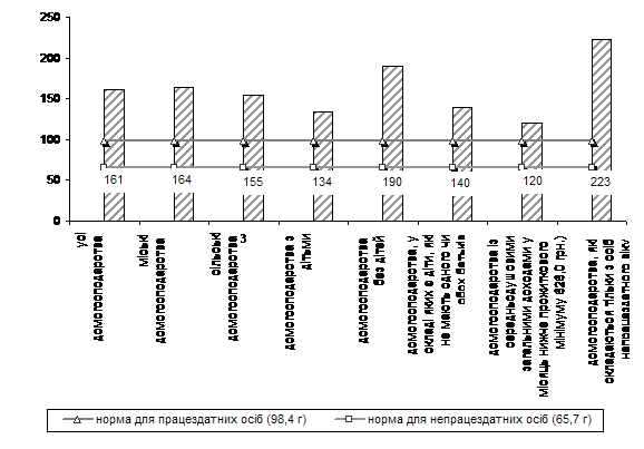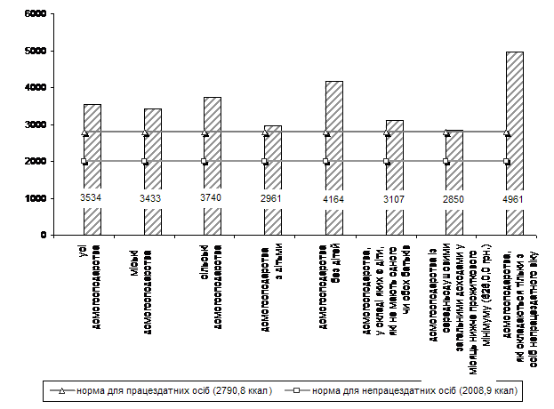 Співставлення фактичної енергетичної цінності у спожитих у домогосподарствах однією особою за добу продуктах харчування у 2008 році з нормами, передбаченими для працездатного та непрацездатного населення1