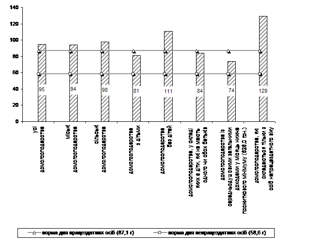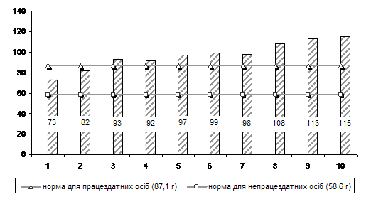 Співставлення фактичного вмісту білків у спожитих у домогосподарствах однією особою за добу продуктах харчування в 2008 році з нормами, передбаченими для працездатного та непрацездатного населення1