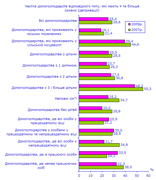 Домогосподарства з дітьми в більшій мірі, ніж домогосподарства без дітей, потерпали від недостатності коштів для своєчасної та в повному обсязі оплати рахунків за житло та необхідні послуги з його утримання або оплати газу для приготування їжі (15% проти 12%), від недостатньої житлової площі, що не перевищує 5 кв.м. на особу (7% проти 2%), від недостатності коштів для отримання будь-якої професійної освіти (11% проти 3%) та від відсутності в населеному пункті, в якому вони проживають, закладів, які надають побутові послуги (20% проти 18%). Домогосподарства без дітей частіше, ніж домогосподарства з дітьми, потерпали від усіх інших ознак позбавлення, зокрема, найбільша різниця (близько чверті проти 18%) спостерігалася у поширенні усіх ознак економічної депривації у сфері охорони здоров'я.