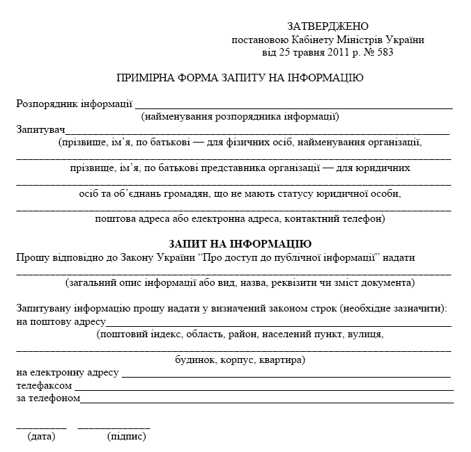 примірну форму запиту на інформацію;